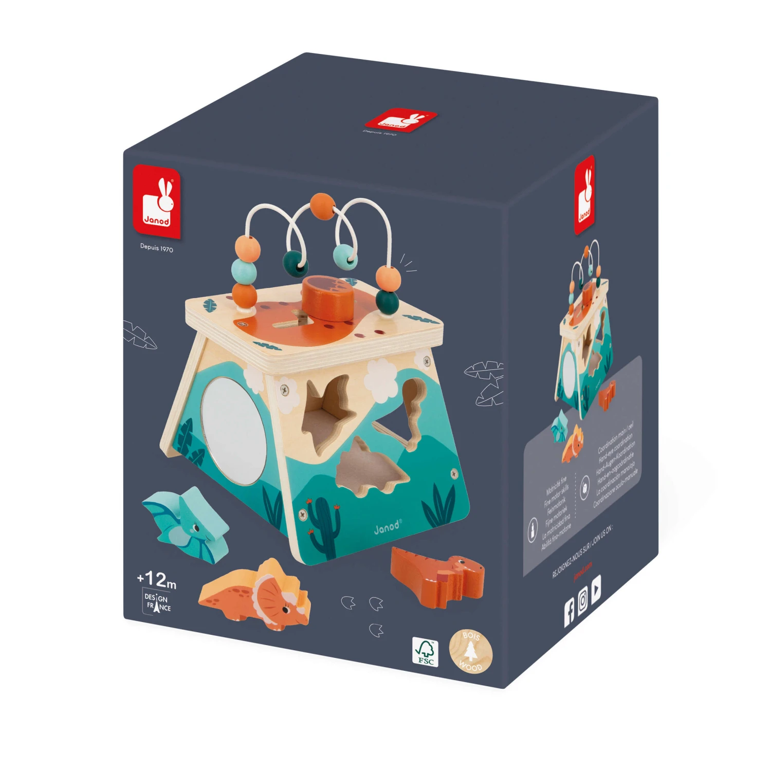 | Les plus du produit | Nombreuses activités : boite à formes, engrenages, miroir, …, Sur le thème emblématique des dinosaures, Développe les sens de bébé |