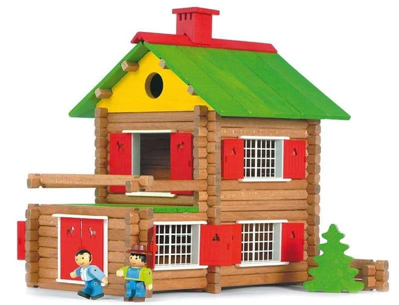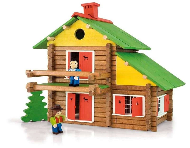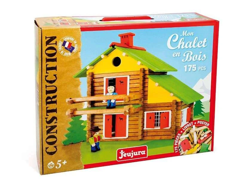 Mon Chalet en Bois – 175 pièces : jeu de construction en bois naturel et teinté avec une notice de montage, valisette carton qui permet de ranger facilement toutes les pièces et de les emmener partout avec soi. – A partir de 5 ans.