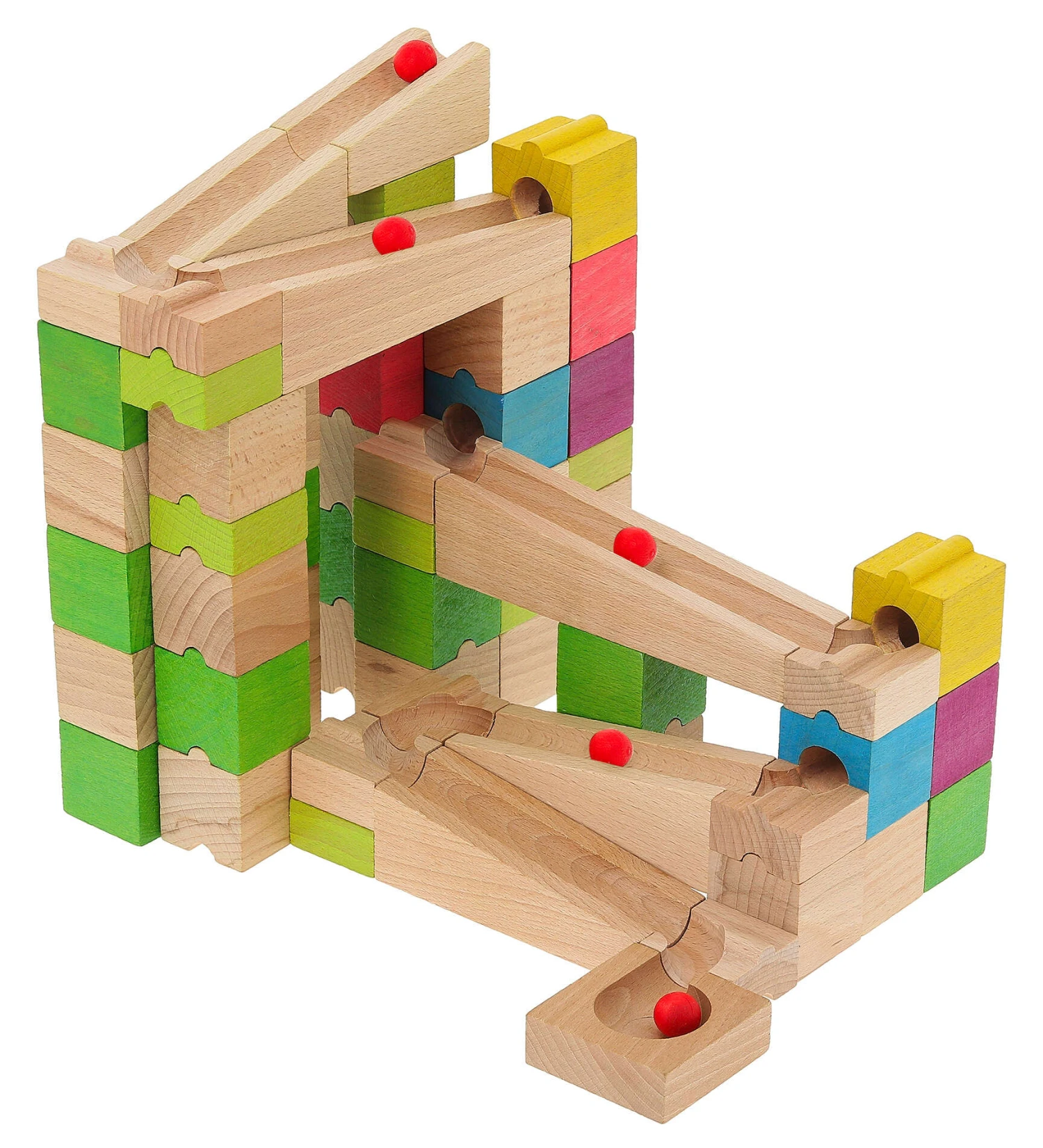 | Contenu du produit | 63 pièces en bois massif et 5 billes en bois + valisette carton |