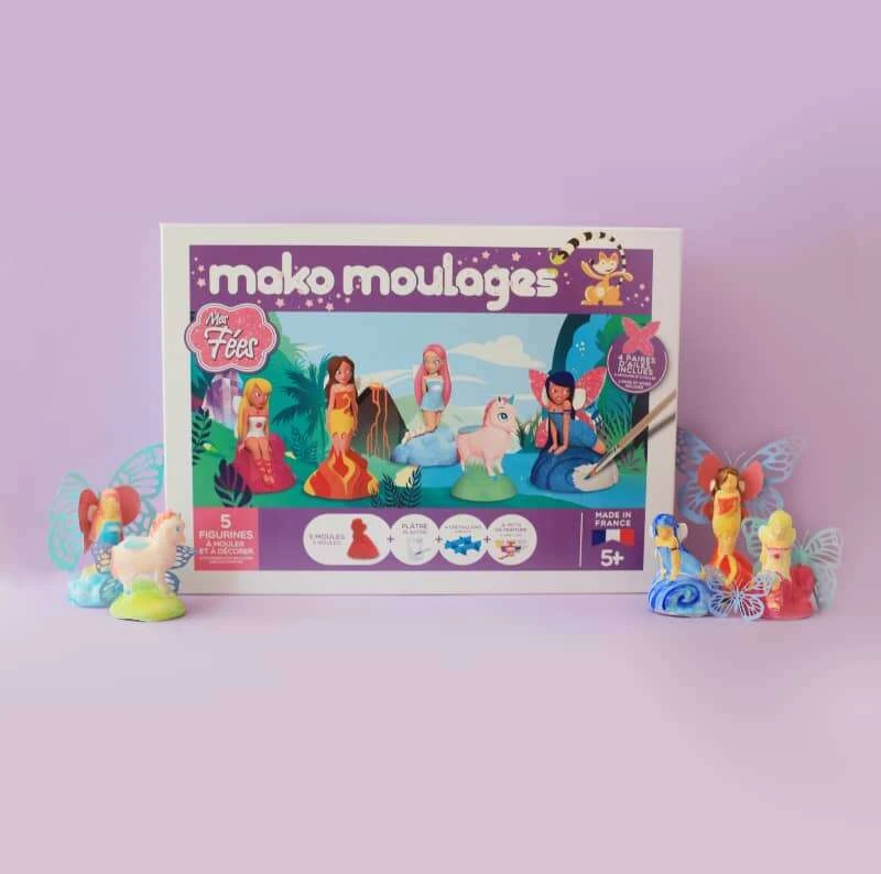 | Contenu du produit | 5 moules en latex (fées eau, terre, air, feu et licorne), 1 sachet de 800g de plâtre, 6 pots de peinture de 5ml, 4 croisillons, 1 pinceau, 1 cuillère doseuse, 1 notice de jeu et 1 planche de 4 paires d’ailes scintillantes ! |