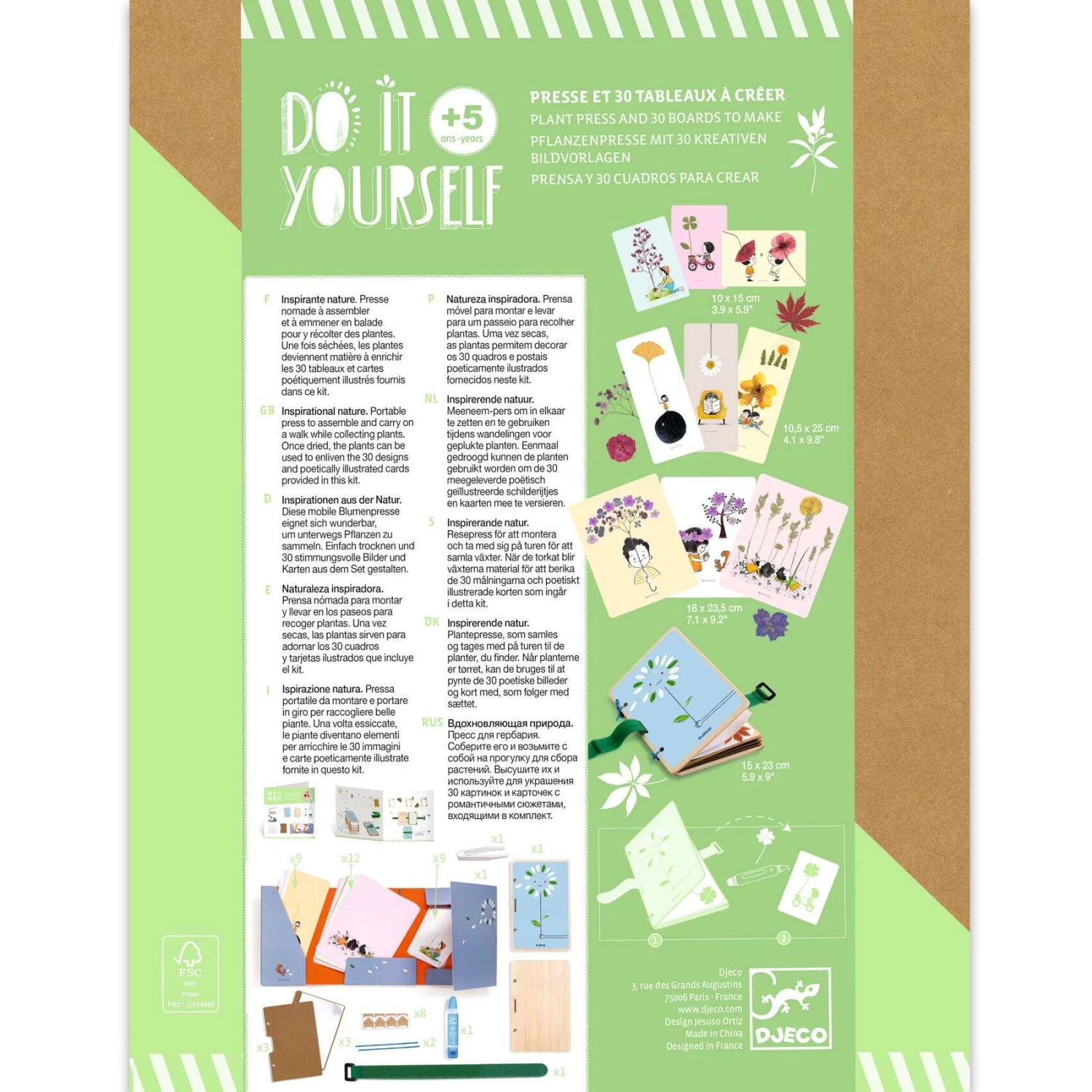| Contenu du produit | 1 presse en bois à assembler,1 pochette de rangement illustrée, 12 tableaux illustrés (18,5 x 23,5 cm), 9 grandes cartes (10,5 x 25 cm), 9 petites cartes (10 x 15 cm), 1 tube de colle liquide, 1 notice explicative. |