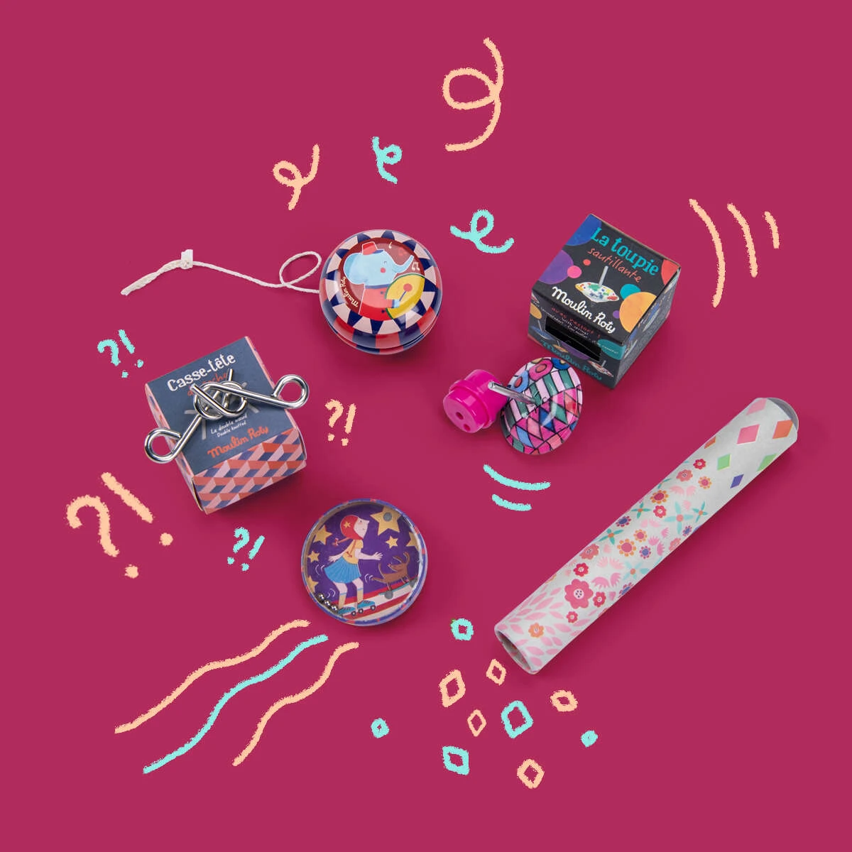 Egayez la fête d’anniversaire de votre enfant avec cette pochette surprise Moulin Roty ! Toupie renversante, casse-tête, jeu de billes ou encore kaléidoscope, des petits jeux intemporels qui feront plaisir à votre petit.