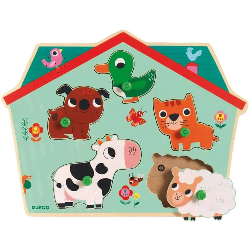Wouf, Miaou, Coin-coin, Bê-bê, Meuh ! L’enfant remet chaque animal à sa place pour découvrir son cri. Contenu : Puzzle sonore en bois de 5 pièces avec 2 piles incluses (LR03 – AAA).