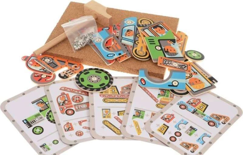 | Contenu du produit | 24 pièces en bois, illustrées et trouées Clous 1 planche de liège 1 marteau en bois 5 cartes Boite en bois |