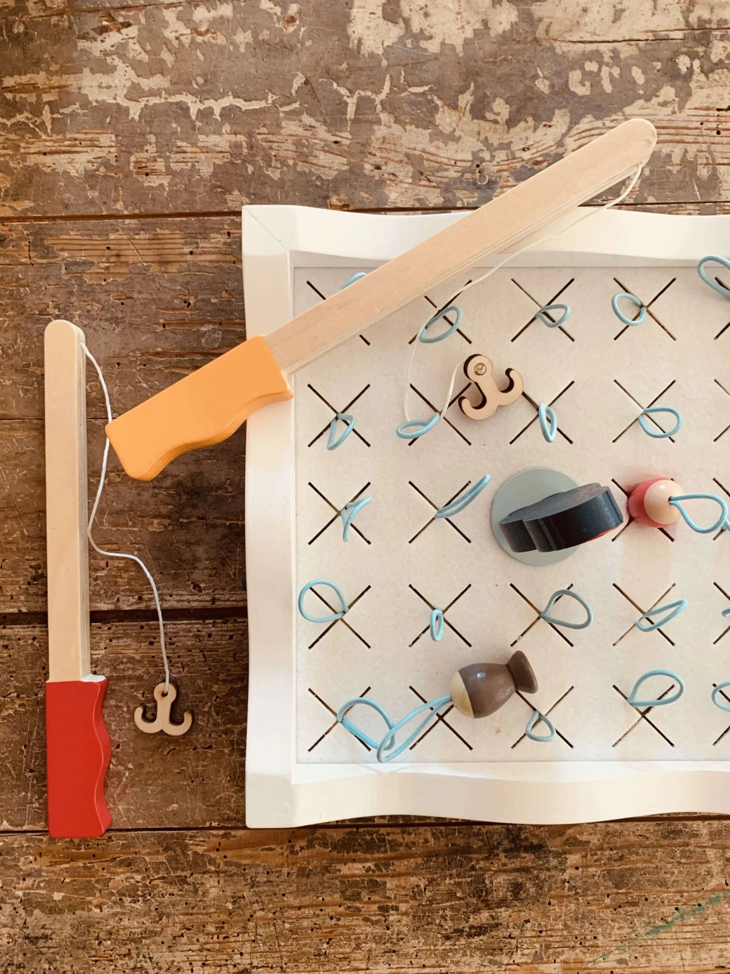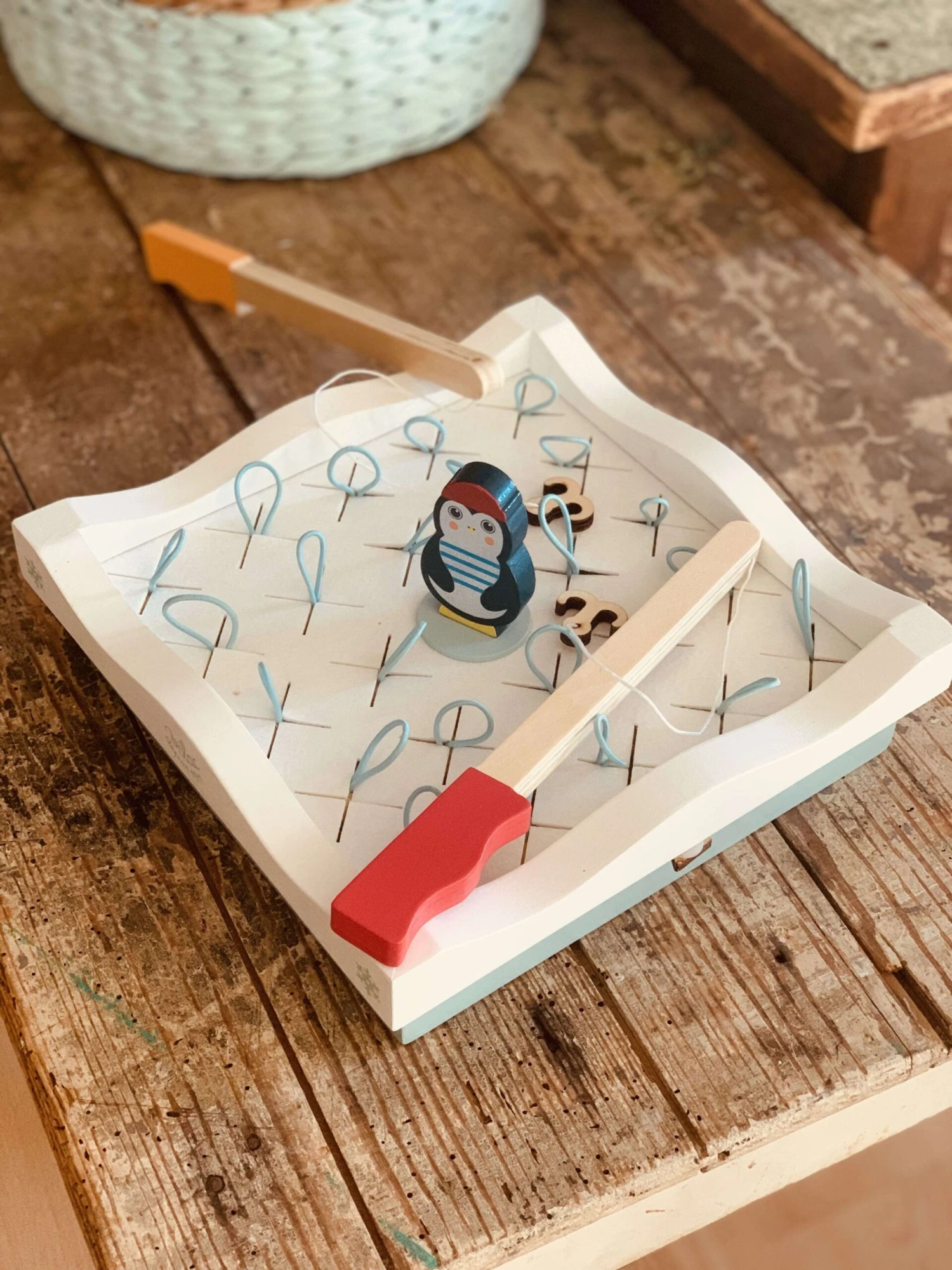 La règle du jeu est simple : Les poissons sont cachés sous la banquise en feutrine. Avec la canne à pêche, il faut pêcher 2 poissons en les soulevant par leur ficelle qui dépasse. Si c’est une paire, c’est gagné, sinon il faut les remettre à leur emplacement.