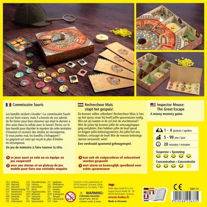 Les bandits veulent s’évader ! Le commissaire Souris est sur leurs traces. Mais il a besoin des talents de fin limier des joueurs : qui s’est assis en dernier dans la cellule avec le tunnel ? Si les joueurs parient sur le bon bandit, ils élucident le mystère de cette tentative d’évasion et attraperont les bandits. Le gagnant est celui qui capture le plus de fugitifs. Un jeu de mémoire semi-coopératif à faire tourner la tête !