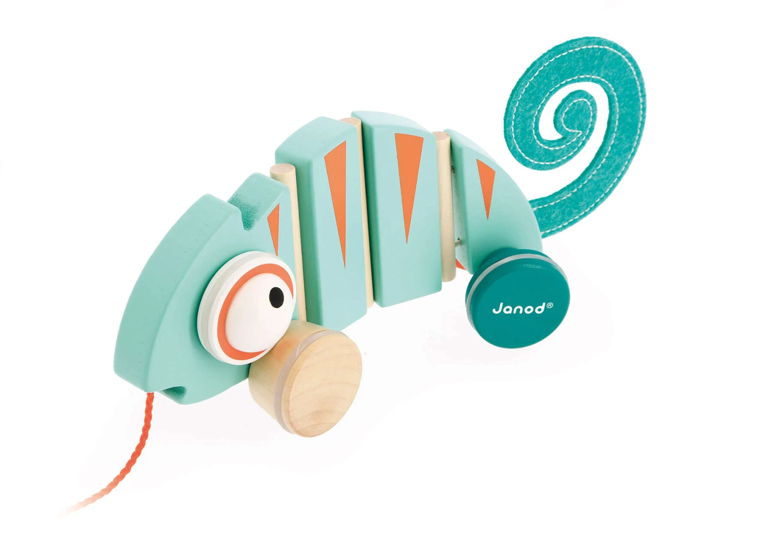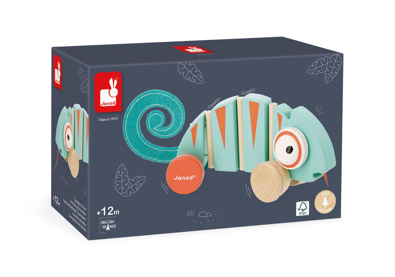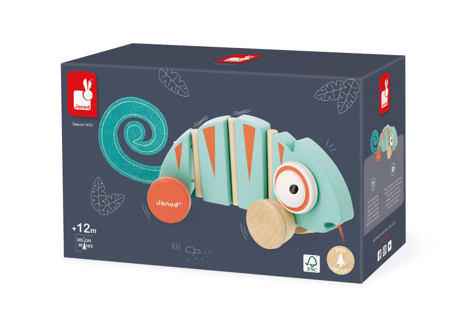 | Les plus du produit | Fabriqué en bois certifié FSC, Les yeux du caméléon roulent quand il avance, Incite bébé à marcher |