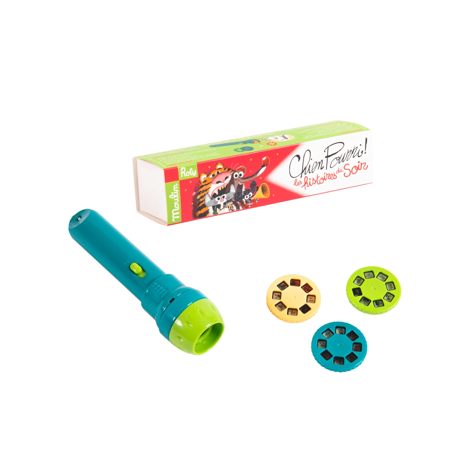 Lampe torche de poche où chacun des 3 disques projetés sur le mur raconte les aventures délirantes de Chien pourri, héros farceur de l’école des loisirs. Les illustrations colorées embarquent l’enfant dans un monde imaginaire où il y a tout à inventer !