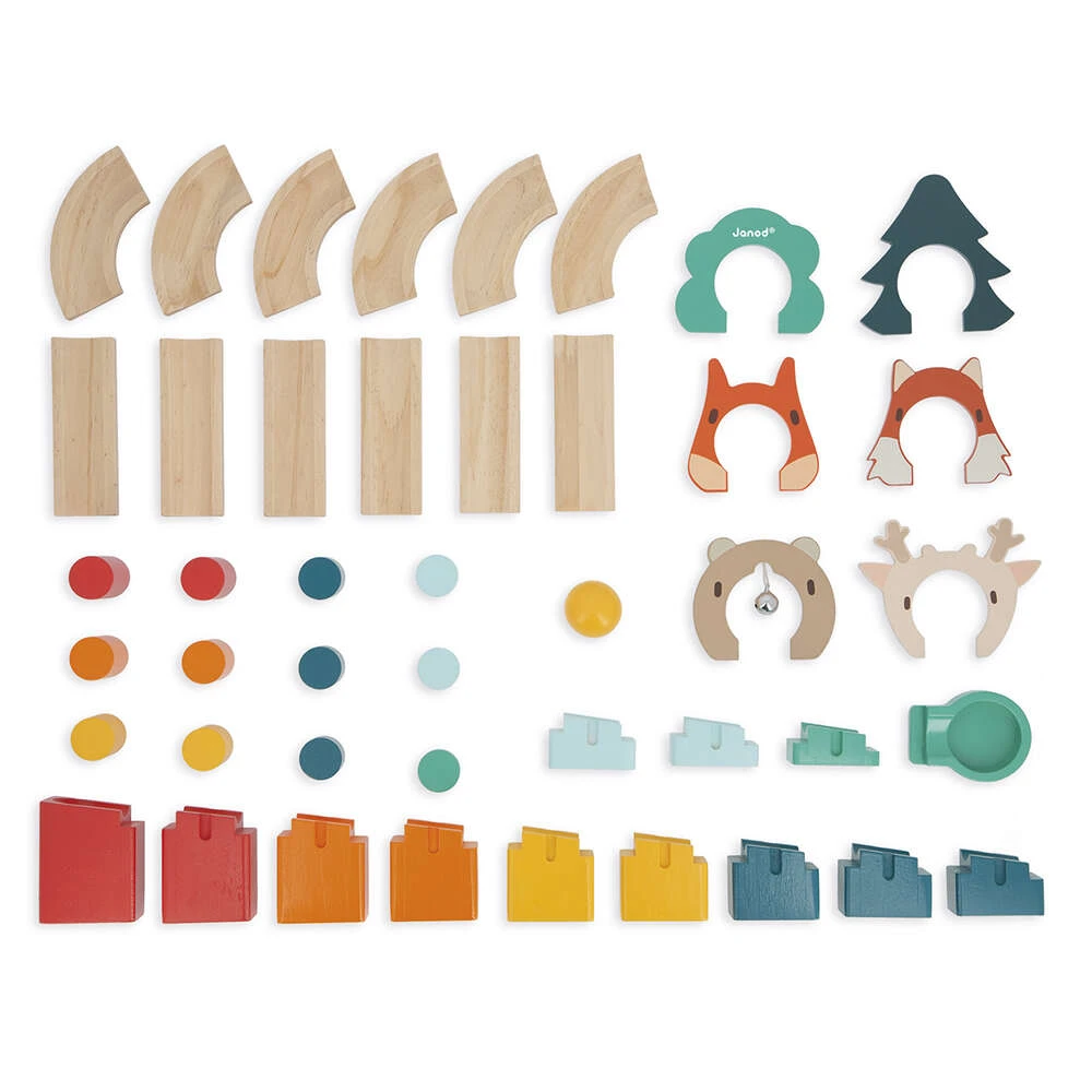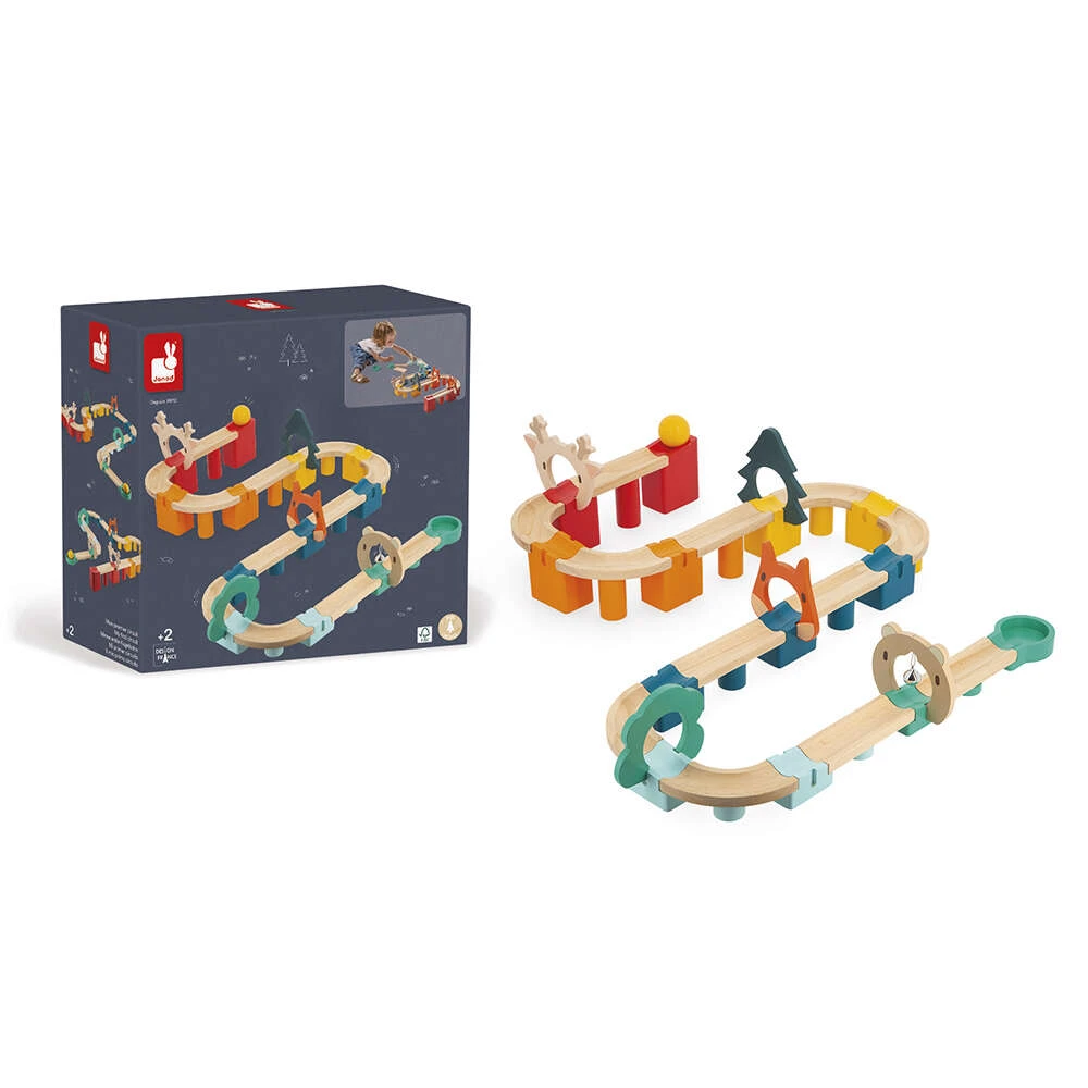 | Contenu du produit | 44 pièces en bois ; 13 connecteurs, 12 piliers, 12 rails, 6 portes et une balle |