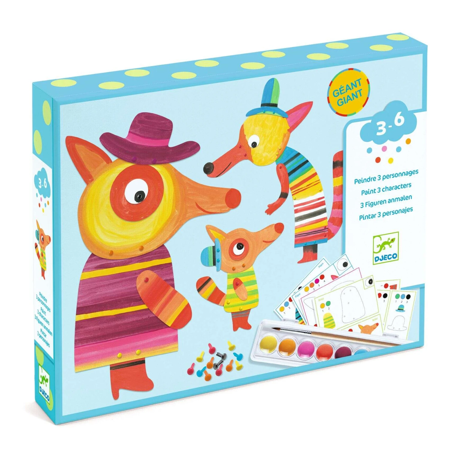 Trois grands personnages à mettre en couleur. Après avoir protégé la table avec la nappe, l’enfant peint toutes les pièces avec le pinceau en faisant des traits. Une fois les pièces sèches, il les assemble avec les attaches parisiennes pour reconstituer : le papa renard (50 cm), la maman (40 cm) et le bébé (28 cm) !