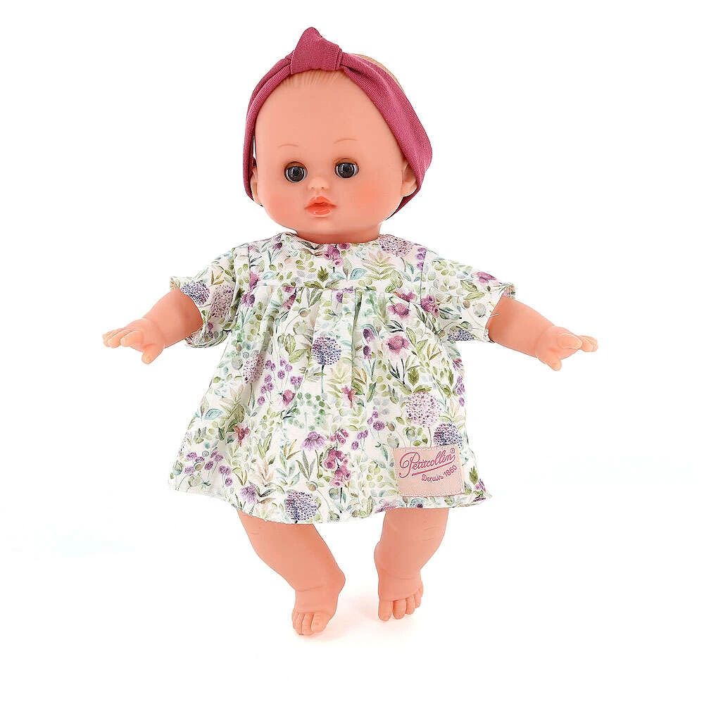Poupon Petit Câlin 28 cm avec habillage « Eléa ». Tête, bras et jambes en vinyle souple au délicat parfum vanille. Corps en tissu. Yeux dormeurs bruns. Cheveux peints blonds. Fabrication européenne. Lavable en machine. A partir de 18 mois. La tenue se compose d’une robe à fleurs, avec son bandeau de couleur framboise.